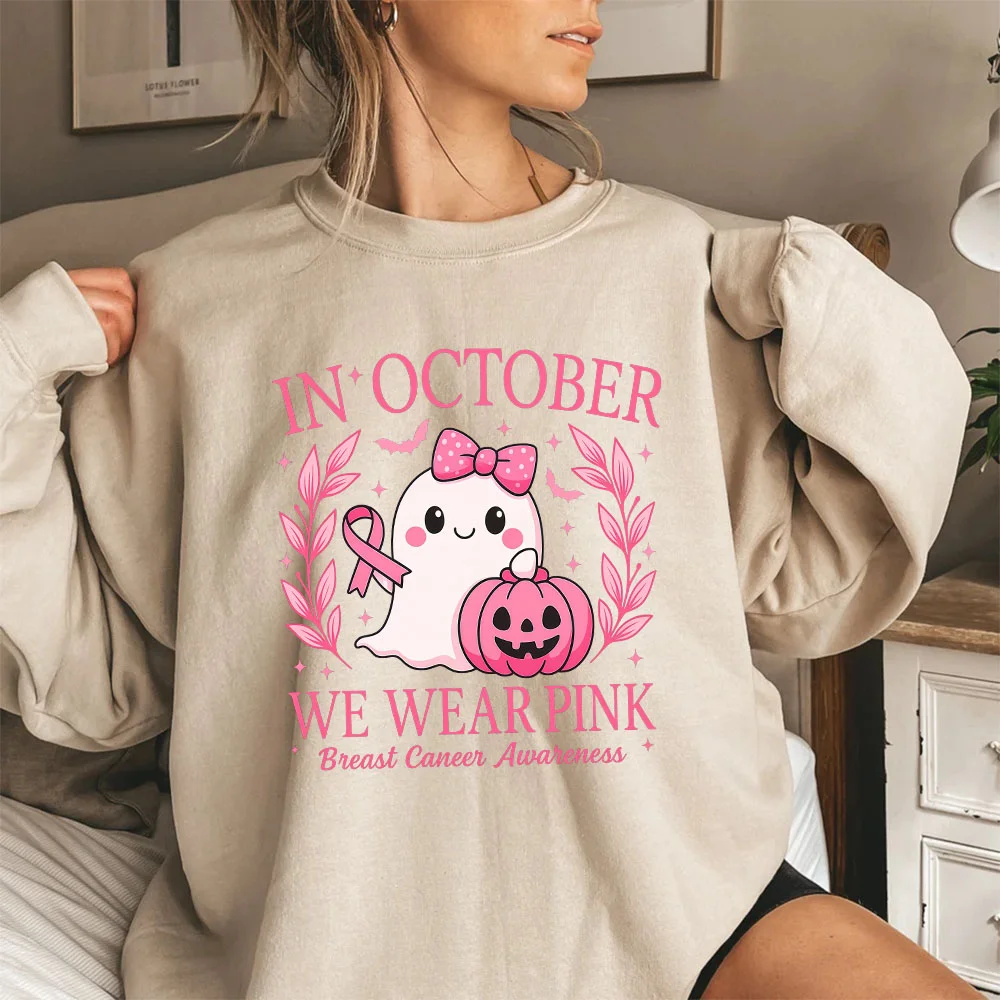In October We Wear Pink Sweatshirt,  Breast Cancer Awareness Halloween V-neck, Sweatshirt, Hoodie